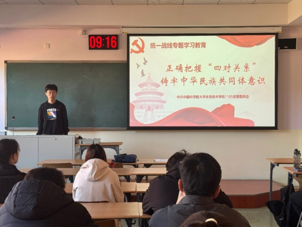 1105班党支部沈锦宇书记从历史脉络、理论内涵、实践要求三个维度,围绕何为中华民族共同体意识、中华民族共同体意识的提出以及新时代新形势下如何铸牢中华民族共同体意识展开讲解,并系统解读中华民族共同体意识的核心内涵。沈锦宇同志呼吁全体党员,要将中华民族共同体意识思想要点学深学透,将其融入学习科研与社会实践,以用实际行动向着中华民族伟大复兴的光辉彼岸奋勇前进。![]()